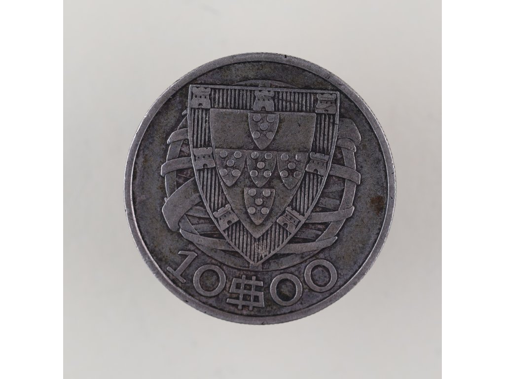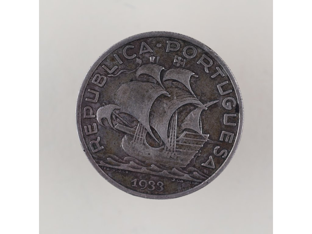 Tato stříbrná mince o nominální hodnotě 10 Escudos pochází z roku 1933, tedy z období Druhé portugalské republiky. Na líci dominuje dynamická karavela plující na rozvlněném moři, orámovaná nápisem República Portuguesa – přímý odkaz na námořní dědictví země a na slavnou epochu objevitelů, kteří otevřeli Portugalcům svět.
