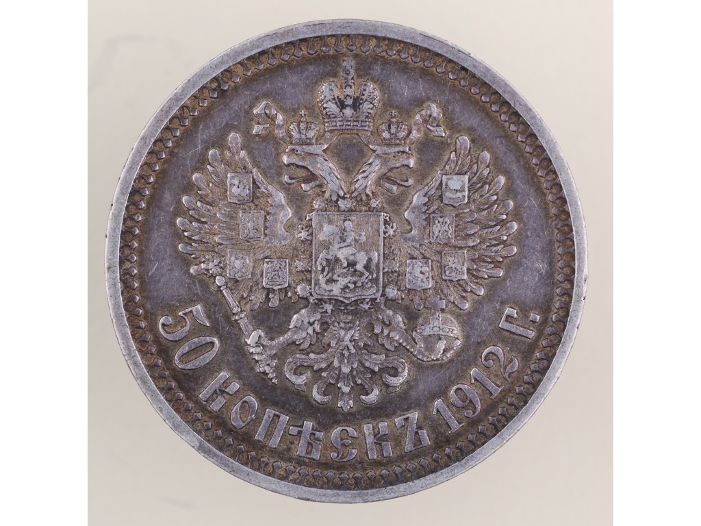 Tato 50kopějková mince z roku 1912 pochází z pozdní fáze vlády Mikuláše II., posledního cara Ruského impéria, který vládl v letech 1894–1917. Jeho abdikace během revoluce v roce 1917 ukončila více než tři století vlády dynastie Romanovců a zároveň i samotné impérium.