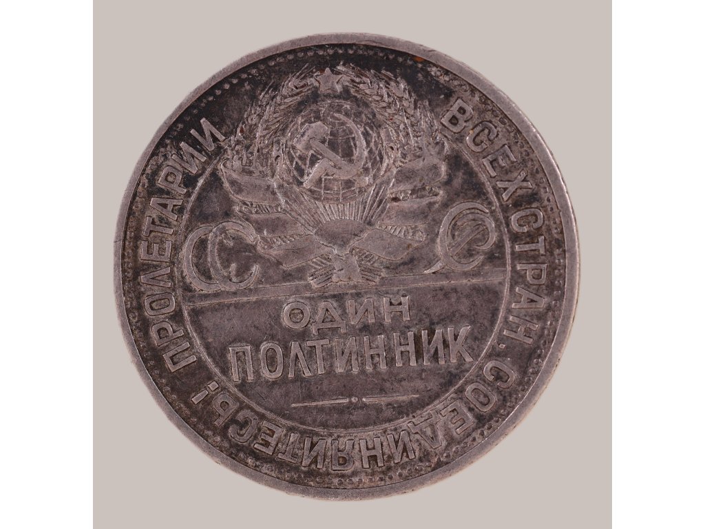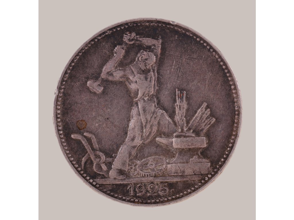 Mince Sovětského svazu z roku 1925 o nominální hodnotě jednoho poltinniku vznikla v období formování nové socialistické ekonomiky a představuje jednu z prvních oficiálních emisí sjednocené měny po vzniku SSSR. Stříbrný půlroubl s motivem dělníka, jenž udeří kladivem o kovadlinu, symbolizuje rozvoj průmyslu a kolektivní úsilí při budování státu. Tento silný obraz se stal symbolem doby, kdy se Sovětský svaz snažil o přechod od agrární společnosti k moderní průmyslové mocnosti.