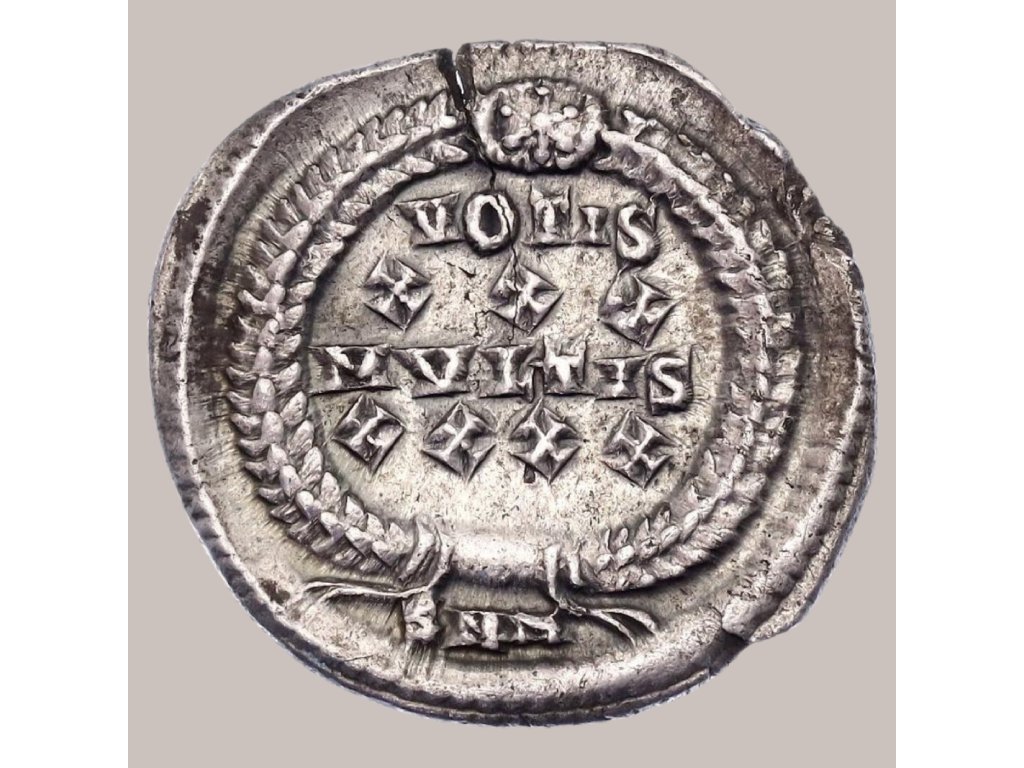Ražba z Nikomédie – významného mincovního centra v Malé Asii – ukazuje císaře s diadémem a vojenským oděvem, což symbolizuje jeho autoritu a kontinuitu vlády. Revers zpravidla nese náboženský nebo imperiální motiv, často s legendou VOTIS či VIRTVS ROMANORVM, a bývá doplněn značkou mincovny s písmeny SMN (Sacra Moneta Nicomedia).