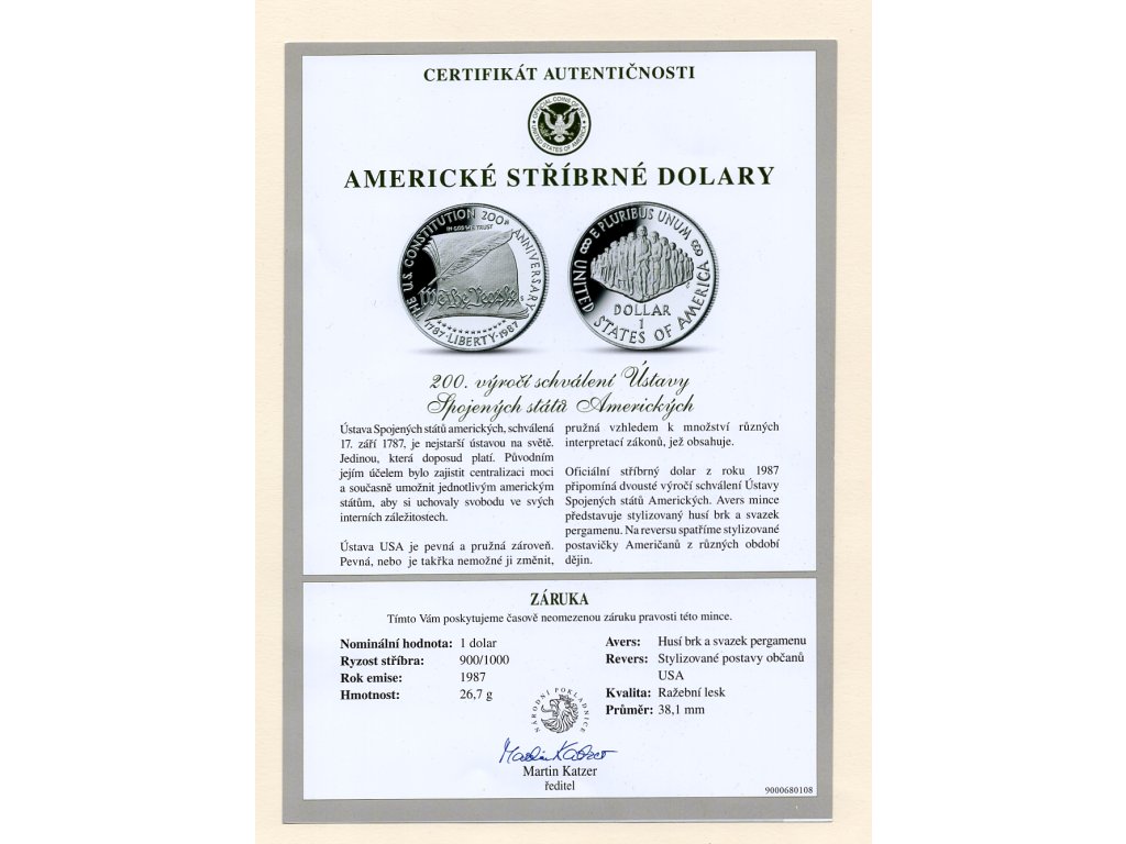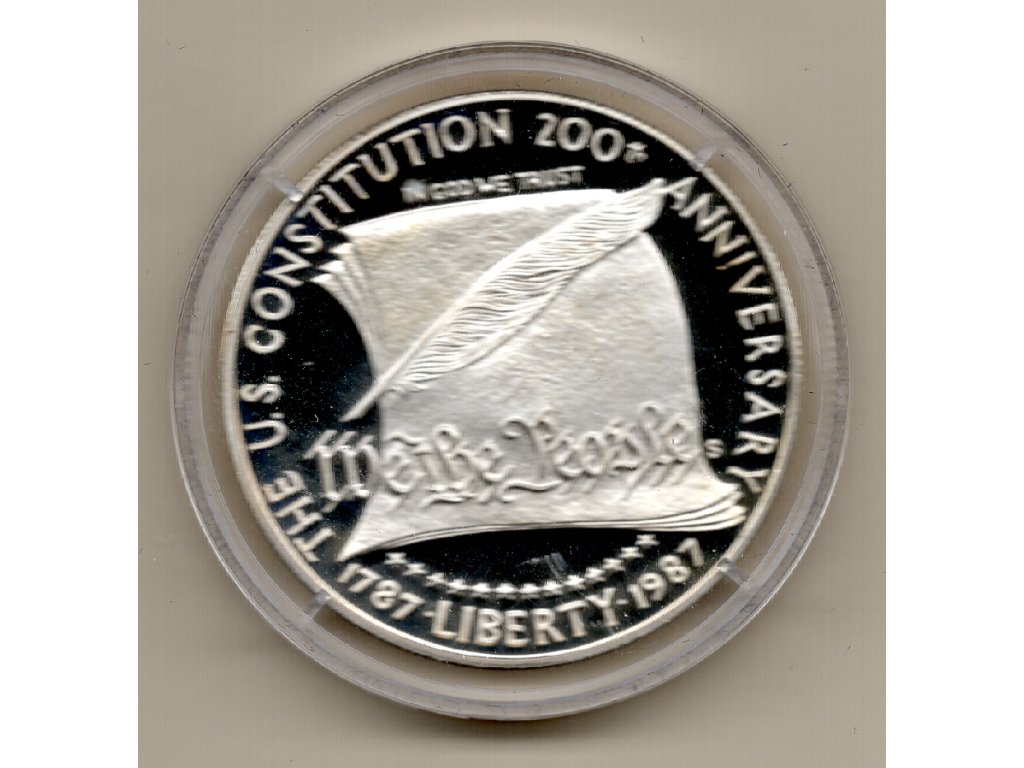 Spojené státy americké vydaly tuto pamětní stříbrnou minci v roce 1987 u příležitosti dvoustého výročí schválení Ústavy USA, která byla přijata 17. září 1787. Tento dokument položil základy federálního uspořádání státu, definoval dělbu moci a stal se jedním z nejvlivnějších ústavních textů v moderních dějinách.