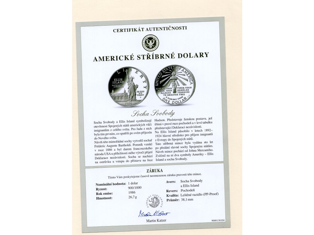 Mince je ražena v kvalitě Proof, tedy leštěnými razidly, což jí dodává výrazně reprezentační charakter. Díky kombinaci ušlechtilého kovu, silného symbolického obsahu a státní garance pravosti představuje tento stříbrný dolar atraktivní sběratelský kus moderní americké numismatiky. Přiložený certifikát autenticity podtrhuje jeho důvěryhodnost a sběratelský význam.