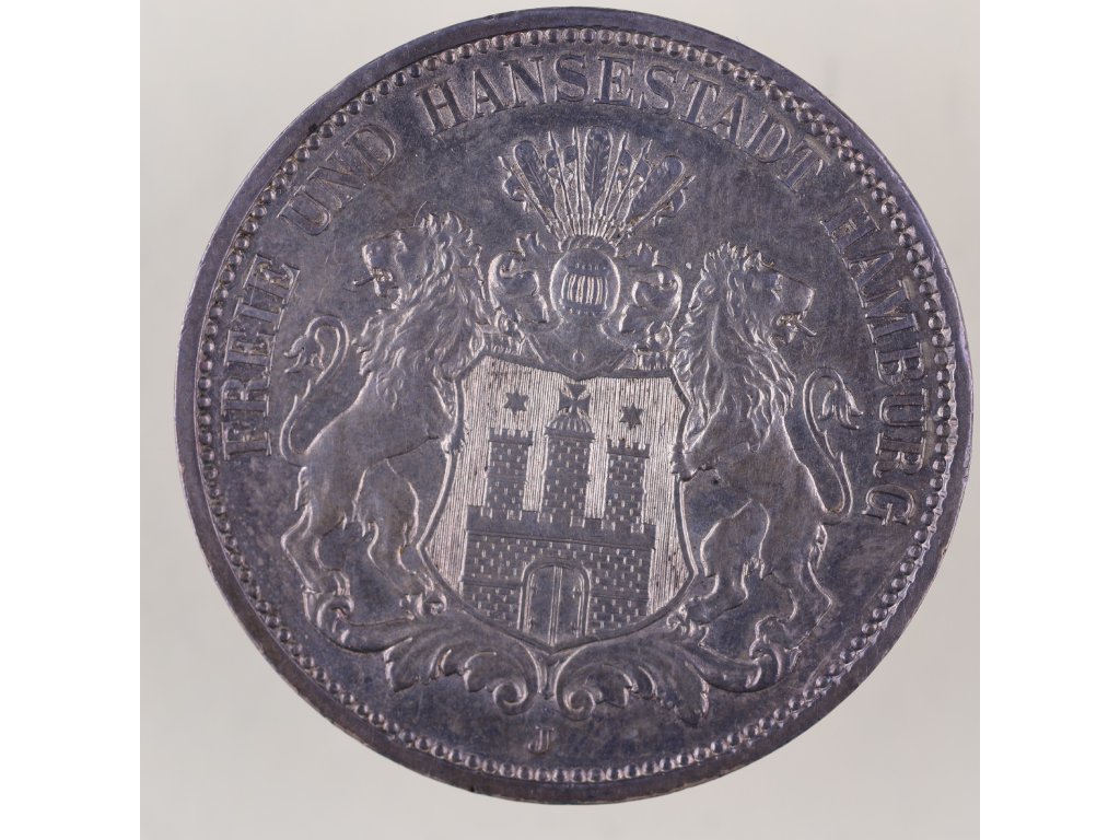 Hamburk, svobodné hanzovní město s dlouhou historií nezávislosti, patřil mezi několik německých států, které si po sjednocení Německa zachovaly právo razit vlastní mince. Tato třímarka z roku 1912 vznikla v době vrcholícího hospodářského rozmachu císařství, těsně před první světovou válkou, a symbolizuje sebevědomí a stabilitu tehdejší měny.