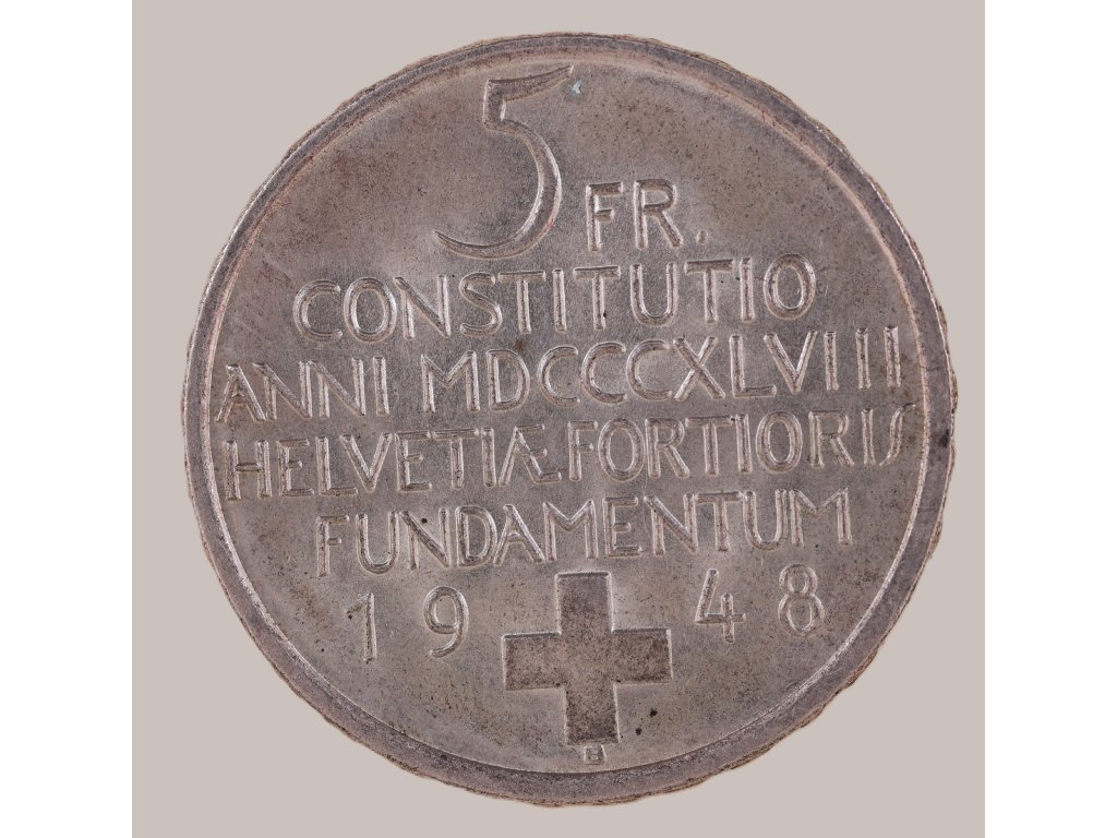 Mince Švýcarska z roku 1948 s nominální hodnotou 5 franků byla vydána jako připomínka stoletého jubilea federální ústavy, která v roce 1848 vytvořila moderní švýcarský stát. Tento dokument sjednotil kantony pod společnou federální vládou a stanovil zásady demokracie, rovnosti a neutrality, které zůstávají základními pilíři švýcarské identity dodnes.