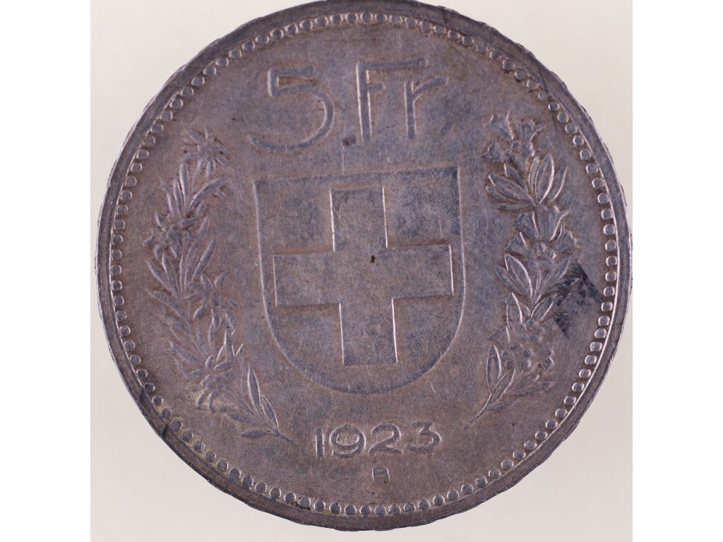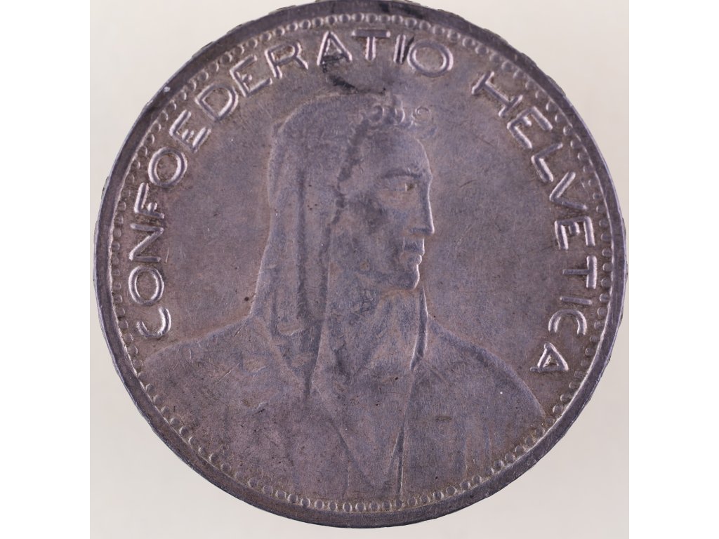 Stříbrná mince o nominální hodnotě 5 franků z roku 1923 patří k nejznámějším typům švýcarské meziválečné numismatiky. Byla navržena sochařem Paulem Burkhardem a zobrazuje na líci bustu alpského pastýře v kápi, často mylně označovaného za Viléma Tella – symbol švýcarské svobody a odporu. Nápis Confoederatio Helvetica odkazuje na oficiální latinský název Švýcarské konfederace.