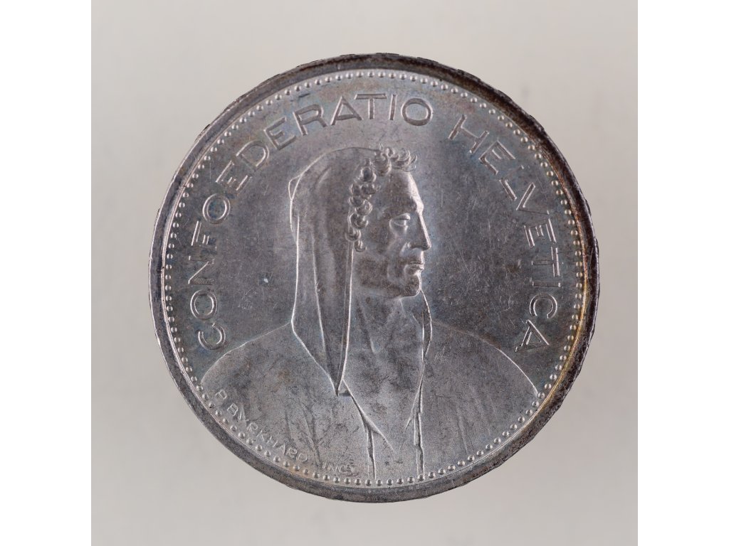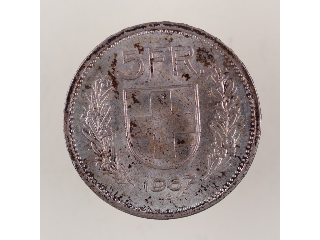 Stříbrná pětifrankovka z roku 1967 představuje tzv. „malý typ“ švýcarské oběžné mince, ražený mezi lety 1931–1969. Autorem ikonického návrhu je švýcarský sochař Paul Burkhard, který vytvořil realistickou podobiznu pastýře s kapucí – často mylně ztotožňovaného s národním hrdinou Vilémem Tellem. Nápis Confoederatio Helvetica označuje oficiální latinský název Švýcarské konfederace.