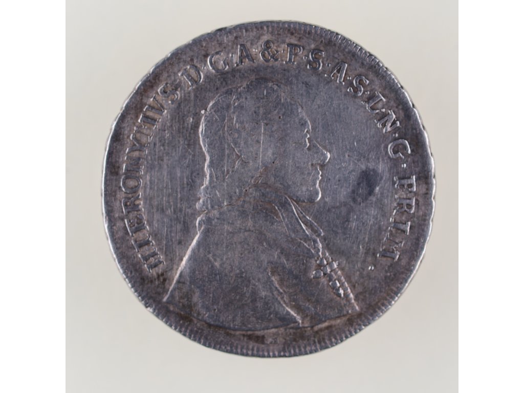 Tento tolar z roku 1773 nese na averzu portrét arcibiskupa s opisem „HIERONYMVS D.G.A.&P.S.A.S.LNG. PRIN.“ (Hieronymus Dei Gratia Archiepiscopus et Princeps Salisburgensis et Lingensis). Na reverzu je Colloredův arcibiskupský erb s korunou, kardinálským kloboukem, mečem a pastýřskou berlou, doplněný letopočtem 1773. Typickým rysem těchto tolarů je jemně propracované heraldické ztvárnění a precizní ražba salcburské mincovny, označené písmenem M.