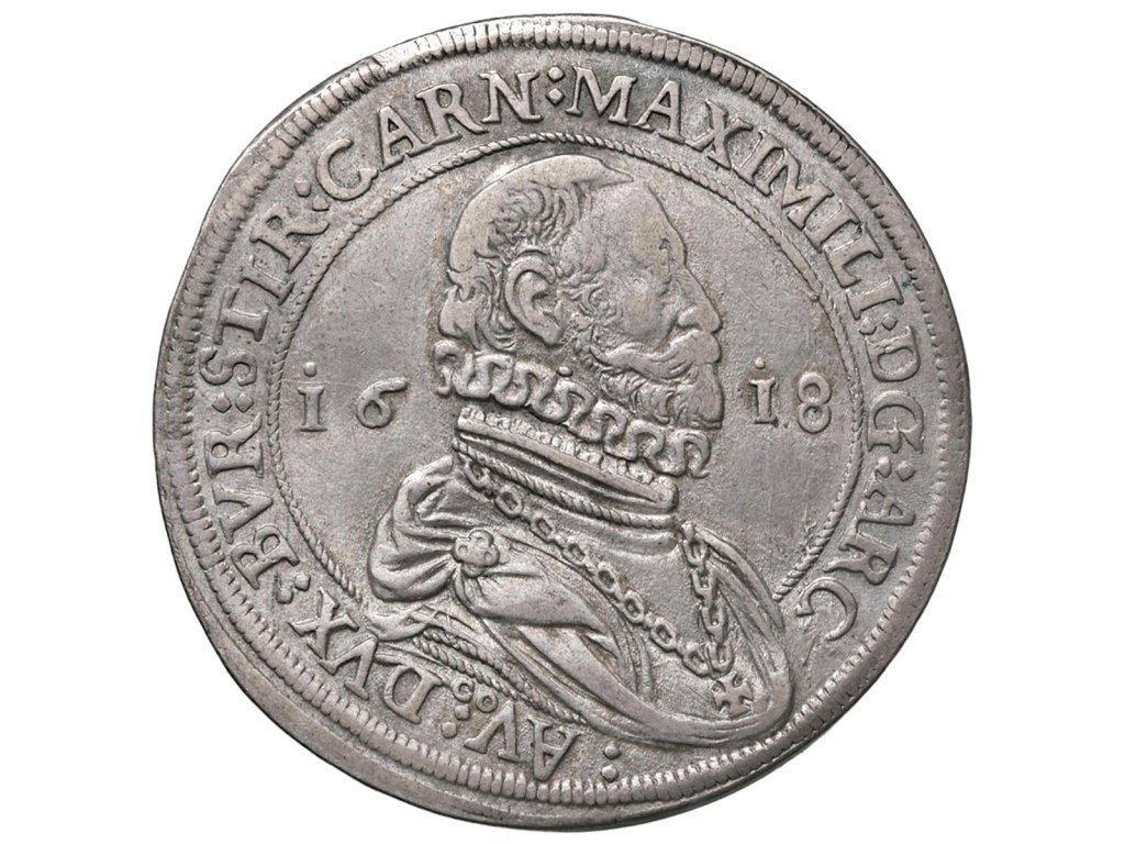 Maxmilián III. Tyrolský (1558–1618), zvaný „Deutschmeister“, byl arcivévodou rakouským, vládcem Tyrolska a velmistrem Řádu německých rytířů. Tento stříbrný tolar, ražený v roce 1618 v mincovně Hall, představuje závěr jeho panovnické éry a zároveň vrchol pozdně renesančního mincovního umění habsburského Tyrolska.
