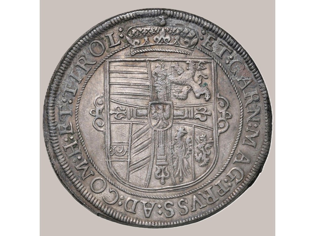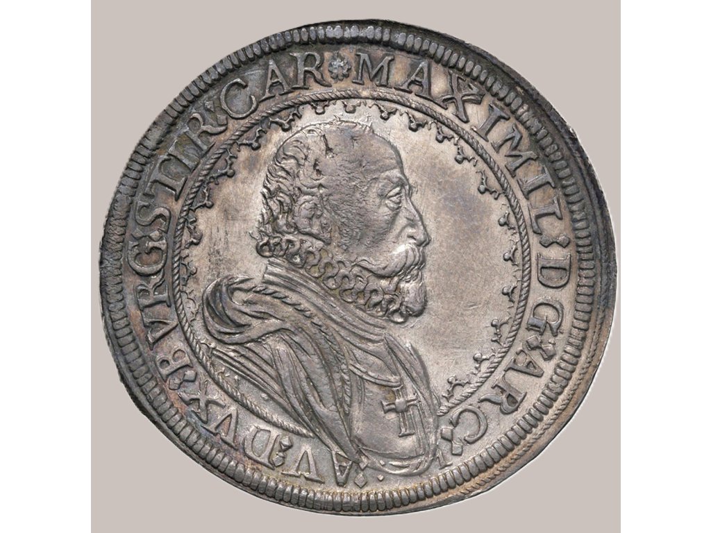 Maxmilián III. Tyrolský (1558–1618), mladší bratr císaře Rudolfa II., vládl Tyrolsku a Předním Rakousům od roku 1595 až do své smrti. Byl známý jako „Deutschmeister“ – velmistr Řádu německých rytířů, což symbolizuje i kříž tohoto řádu na jeho krku, patrný na portrétu na lícní straně mince. Tento stříbrný tolar pochází z proslulé mincovny v Hallu, která byla jedním z nejvýznamnějších center evropského mincovnictví 16. a 17. století.