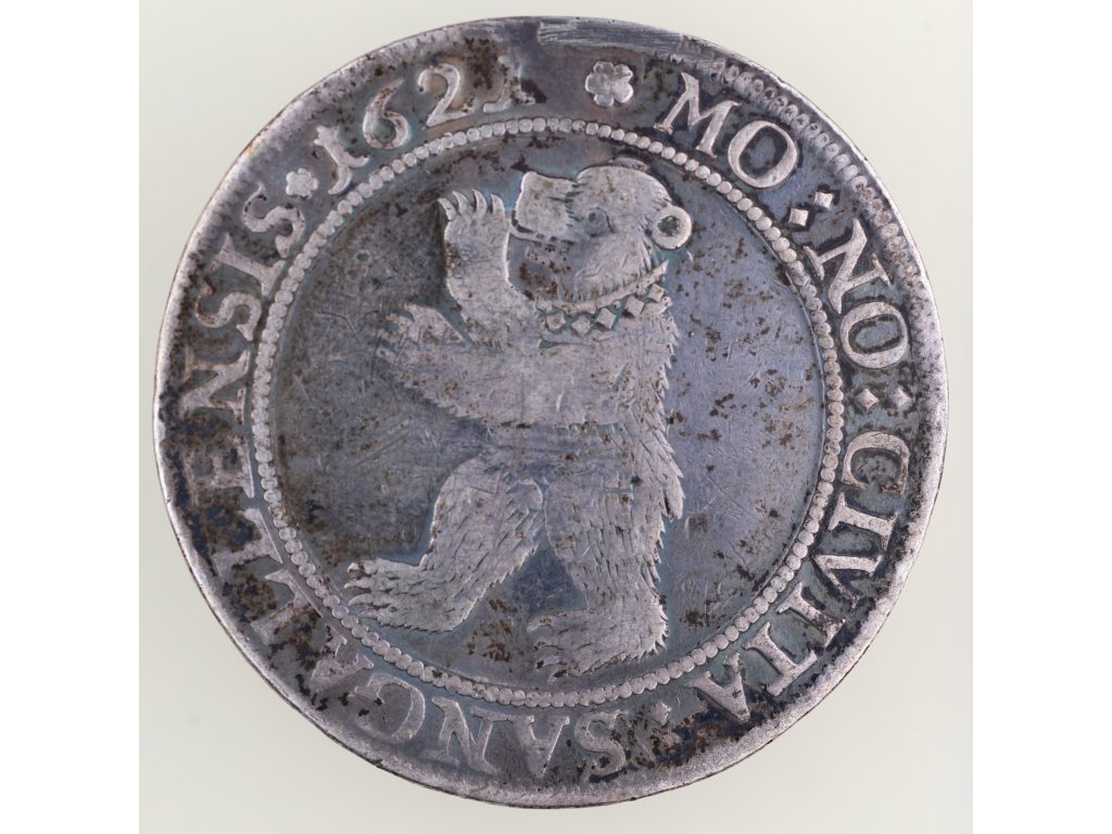 Tento historický tolar pochází z let 1620–1624 a byl ražen ve svobodném říšském městě Sankt Gallen, které tehdy patřilo mezi nejvýznamnější městské státy v rámci Svaté říše římské. Averz nese typický symbol města – kráčejícího medvěda s obojkem, zatímco reverz zdobí dvouhlavý orol pod císařskou korunou, znak samotné říše.
