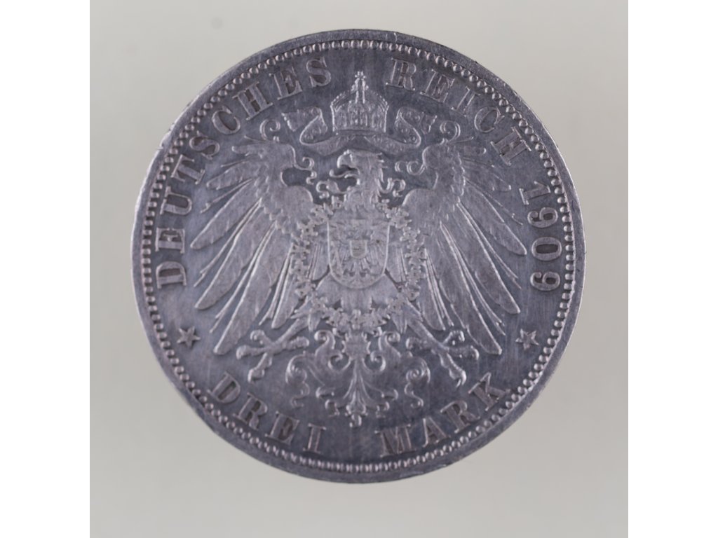 Mince nese na líci portrét panovníka s opisem WILHELM II DEUTSCHER KAISER KÖNIG V. PREUSSEN. Na rubu se nachází korunovaný říšský orel s nápisem DEUTSCHES REICH 1909 a hodnotou DREI MARK. Tyto mince byly raženy z vysoce kvalitního stříbra ryzosti 900/1000 s příměsí 10 % mědi, což jim zajišťovalo pevnost i lesk. Ražba probíhala v Berlíně, což dokládá značka „A“ pod portrétem panovníka.