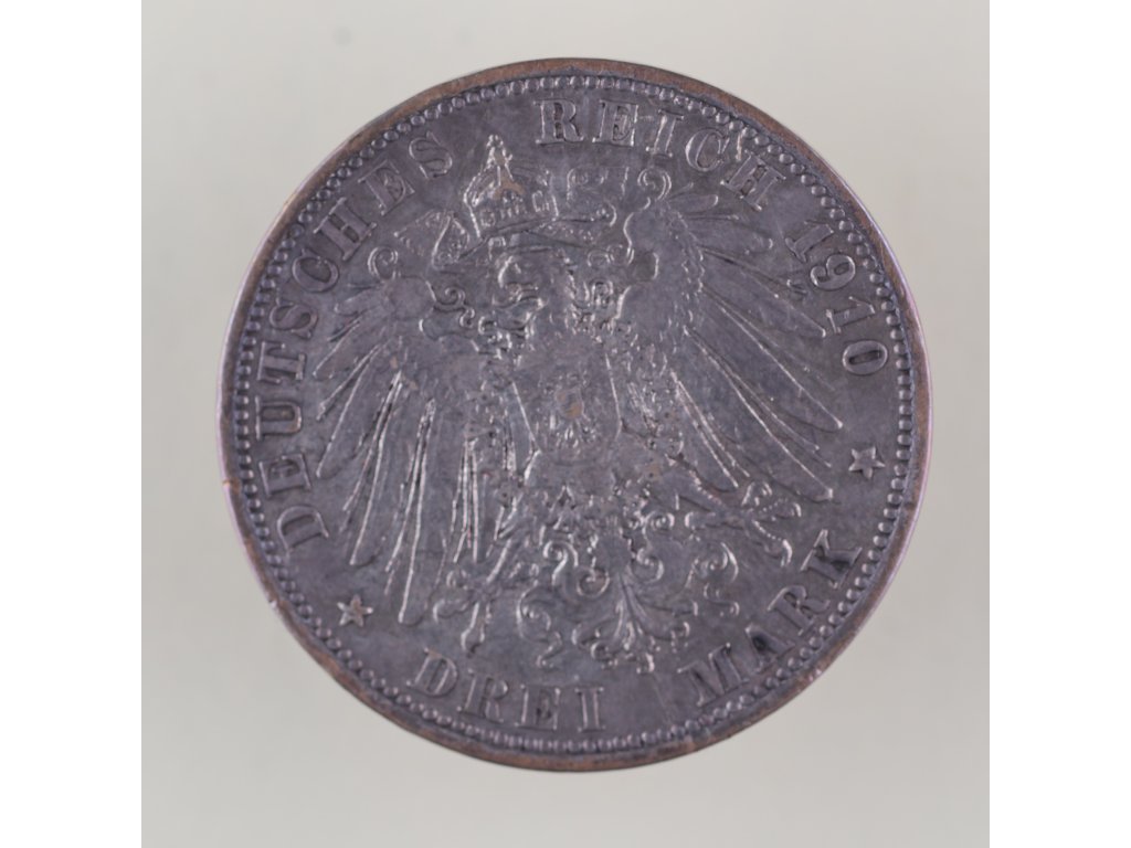 Mince nese na líci portrét panovníka s opisem WILHELM II DEUTSCHER KAISER KÖNIG V. PREUSSEN. Na rubu se nachází korunovaný říšský orel s nápisem DEUTSCHES REICH 1910 a hodnotou DREI MARK. Tyto mince byly raženy z vysoce kvalitního stříbra ryzosti 900/1000 s příměsí 10 % mědi, což jim zajišťovalo pevnost i lesk. Ražba probíhala v Berlíně, což dokládá značka „A“ pod portrétem panovníka.