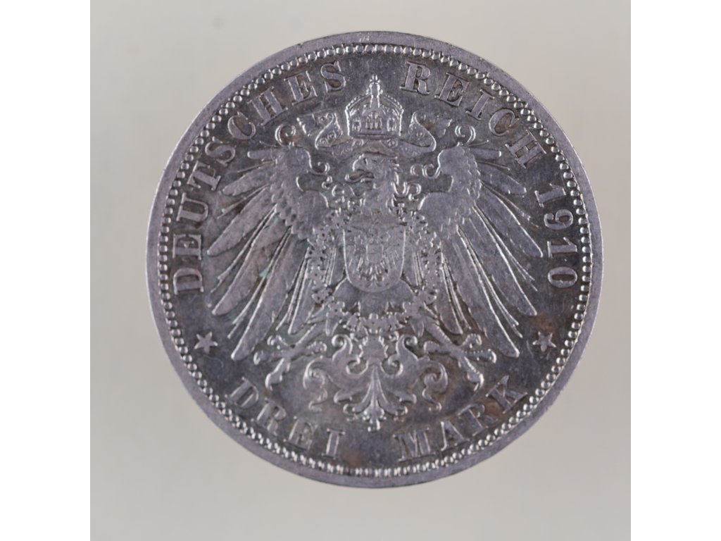 Mince nese na líci portrét panovníka s opisem WILHELM II DEUTSCHER KAISER KÖNIG V. PREUSSEN. Na rubu se nachází korunovaný říšský orel s nápisem DEUTSCHES REICH 1910 a hodnotou DREI MARK. Tyto mince byly raženy z vysoce kvalitního stříbra ryzosti 900/1000 s příměsí 10 % mědi, což jim zajišťovalo pevnost i lesk. Ražba probíhala v Berlíně, což dokládá značka „A“ pod portrétem panovníka.