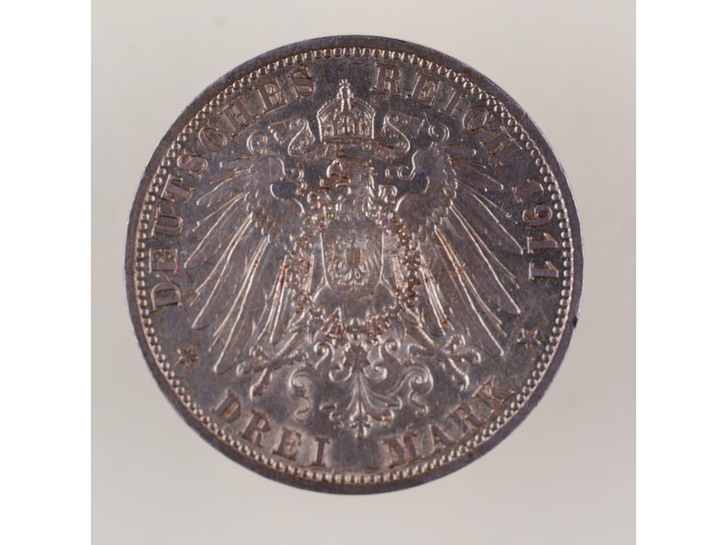 Mince nese na líci portrét panovníka s opisem WILHELM II DEUTSCHER KAISER KÖNIG V. PREUSSEN. Na rubu se nachází korunovaný říšský orel s nápisem DEUTSCHES REICH 1911 a hodnotou DREI MARK. Tyto mince byly raženy z vysoce kvalitního stříbra ryzosti 900/1000 s příměsí 10 % mědi, což jim zajišťovalo pevnost i lesk. Ražba probíhala v Berlíně, což dokládá značka „A“ pod portrétem panovníka.
