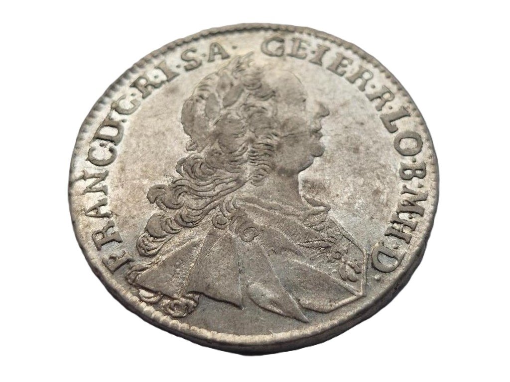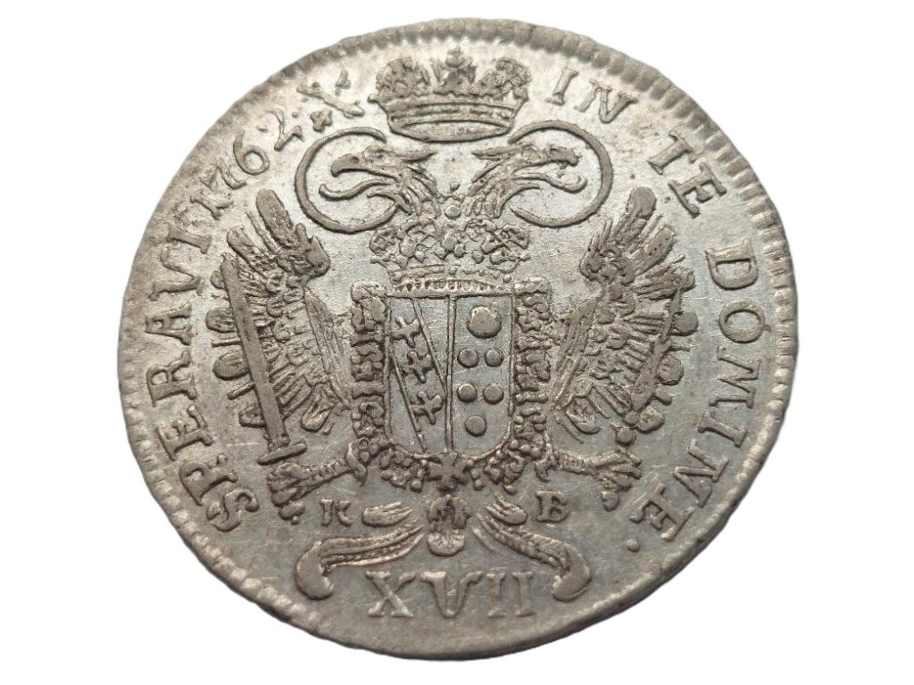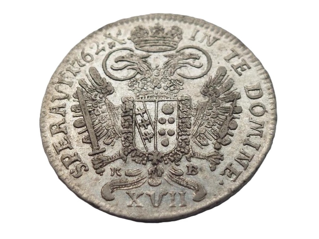 Tato historická mince představuje XVII krejcar z roku 1762, vyražený v Kremnici (značka KB) za panování císaře Františka I. Lotrinského, manžela Marie Terezie. Averz mince nese portrét panovníka. Reverz zobrazuje bohatě vyvedený rakouský dvouhlavý orel s císařským znakem a nápisem IN TE DOMINE SPERAVI 1762.