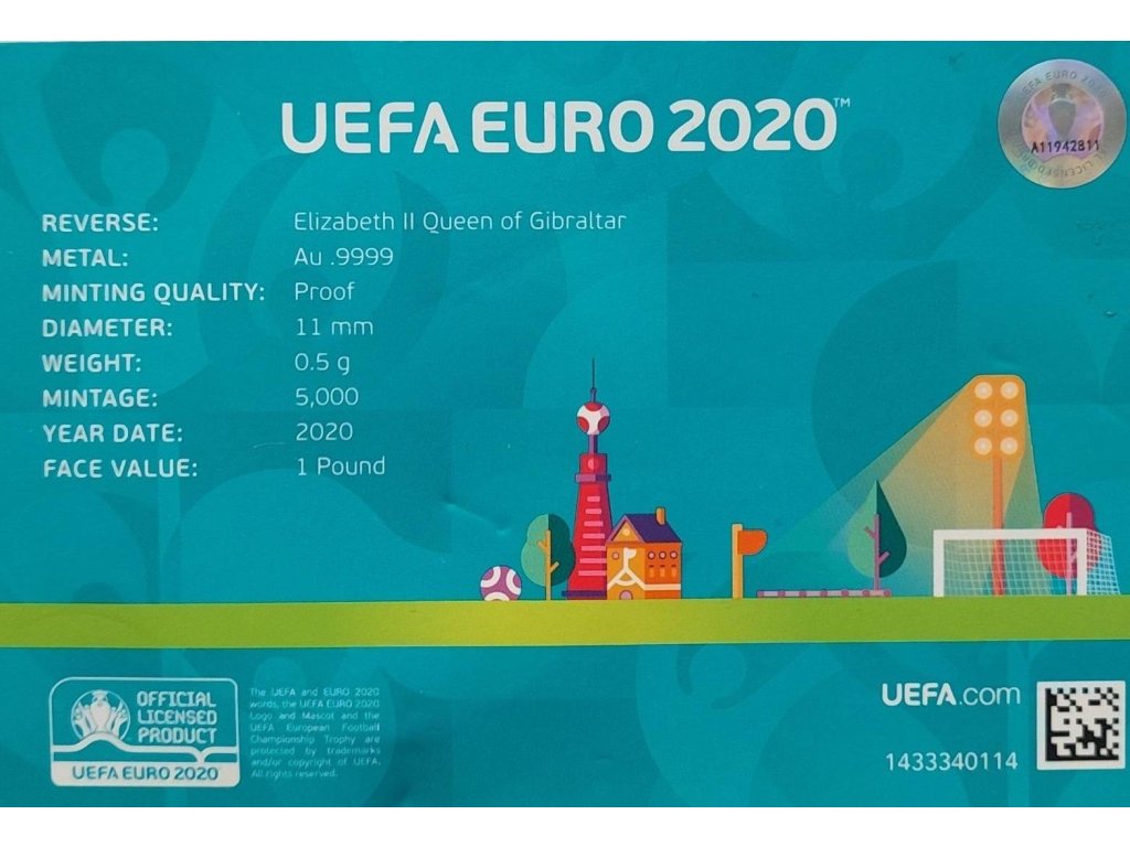 Tato oficiální zlatá mince byla emitována v roce 2020 k příležitosti evropského fotbalového šampionátu UEFA EURO 2020. Vyražena byla v nejvyšší mincovní kvalitě Proof a s vysokou ryzostí 99,99 % zlata, přičemž její hmotnost činí 0,5 gramu a průměr 11 mm. Mince nese nominální hodnotu 1 pound a na reverzní straně portrét britské panovnice Alžběty II. jako královny Gibraltaru. Motiv UEFA trofeje v popředí připomíná jednu z nejsledovanějších sportovních událostí světa. Limitovaný náklad pouhých 5 000 kusů zajišťuje vysokou sběratelskou atraktivitu, a to jak pro fotbalové nadšence, tak pro investory do vzácných drahých kovů. Oficiální licencovaný produkt UEFA s hologramem a balením dává jistotu autenticity a kvality.