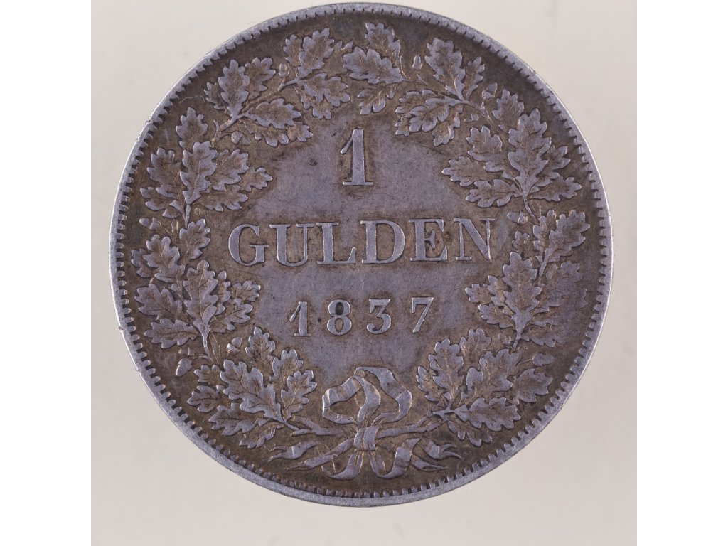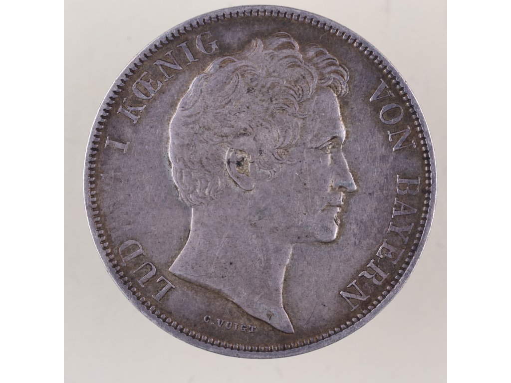 Tento historický 1 gulden pochází z Království Bavorsko a byl ražen v roce 1837, v době vlády Ludvíka I. (Ludwig I., 1825–1848), panovníka známého svou podporou umění, architektury a německého nacionalismu. Jeho portrét s výraznými rysy a vlnitými vlasy je dílem významného rytce Carl Voigt, jehož podpis „C. VOIGT“ nalezneme pod krkem panovníka.