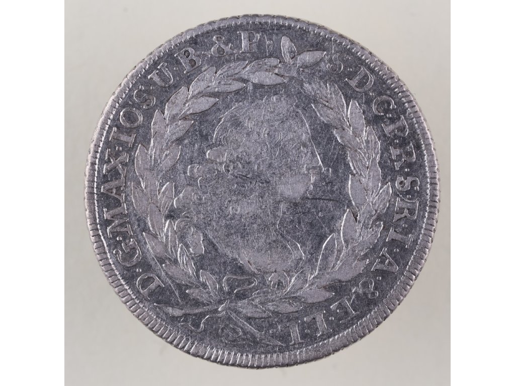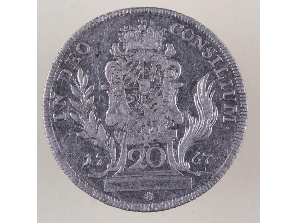 Stříbrná mince o hodnotě 20 krejcarů z roku 1767, ražená v Mnichově za vlády bavorského kurfiřta Maxmiliána III. Josefa z rodu Wittelsbachů. Patří mezi oběžné mince období tzv. konvenční měny, kdy byl zaveden systém založený na stříbrném tolaru jako jednotce. Typická ražba s jemným portrétem panovníka a detailním erbem představuje vysoce kvalitní ukázku bavorského mincovnictví 18. století.