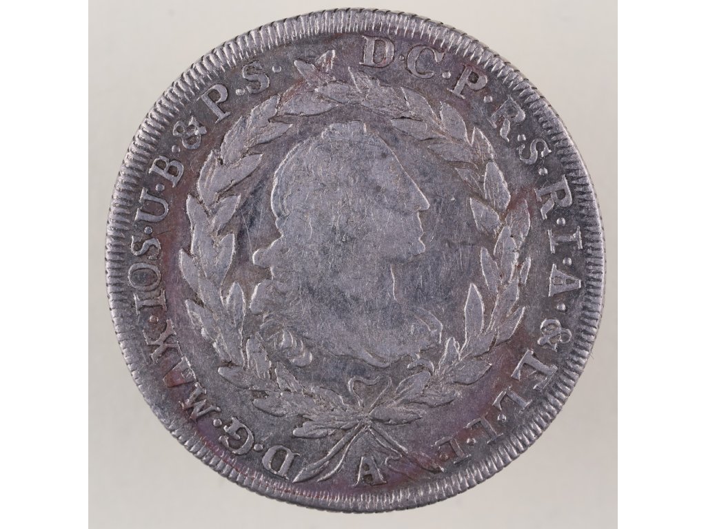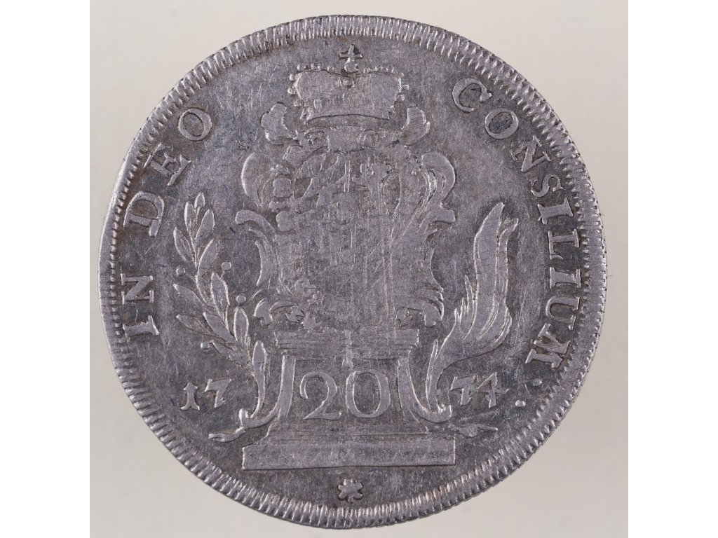 Stříbrná mince o hodnotě 20 krejcarů z roku 1774, ražená v Ambergu za vlády bavorského kurfiřta Maxmiliána III. Josefa z rodu Wittelsbachů. Patří mezi oběžné mince období tzv. konvenční měny, kdy byl zaveden systém založený na stříbrném tolaru jako jednotce. Typická ražba s jemným portrétem panovníka a detailním erbem představuje vysoce kvalitní ukázku bavorského mincovnictví 18. století.