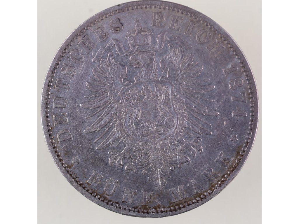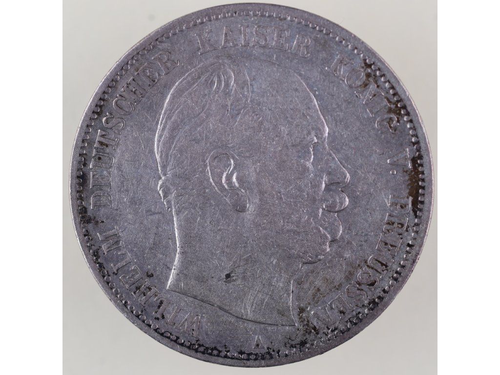Tento kus o nominální hodnotě 5 Mark byl ražen v letech 1891–1908 za vlády Viléma II. (1888–1918), posledního německého císaře a pruského krále. Averz nese jeho výrazný portrét s charakteristickými rysy, zatímco reverz zdobí císařský orel, majestátní symbol jednoty a moci Německé říše. Pětimarky patřily k nejvyšším stříbrným nominálům své doby a byly raženy z kvalitního kovu o ryzosti .900. Tyto mince nejen sloužily v oběhu, ale také reprezentovaly mocenské a kulturní ambice císařského Německa před první světovou válkou. Po roce 1920 byly sice demonetizovány, avšak dnes jsou vyhledávanými sběratelskými artefakty, které přinášejí autentické svědectví o éře pruské dominance a císařské hrdosti.