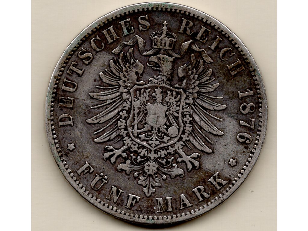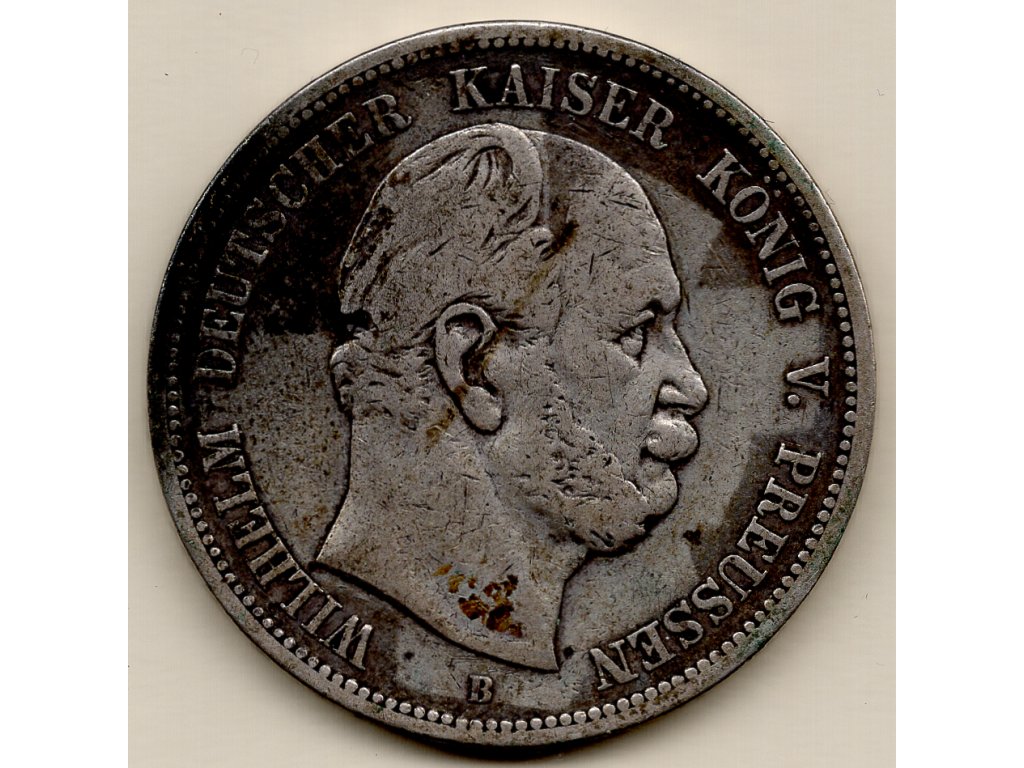 Tento kus o nominální hodnotě 5 Mark byl ražen v letech 1891–1908 za vlády Viléma II. (1888–1918), posledního německého císaře a pruského krále. Averz nese jeho výrazný portrét s charakteristickými rysy, zatímco reverz zdobí císařský orel, majestátní symbol jednoty a moci Německé říše. Pětimarky patřily k nejvyšším stříbrným nominálům své doby a byly raženy z kvalitního kovu o ryzosti .900. Tyto mince nejen sloužily v oběhu, ale také reprezentovaly mocenské a kulturní ambice císařského Německa před první světovou válkou. Po roce 1920 byly sice demonetizovány, avšak dnes jsou vyhledávanými sběratelskými artefakty, které přinášejí autentické svědectví o éře pruské dominance a císařské hrdosti.