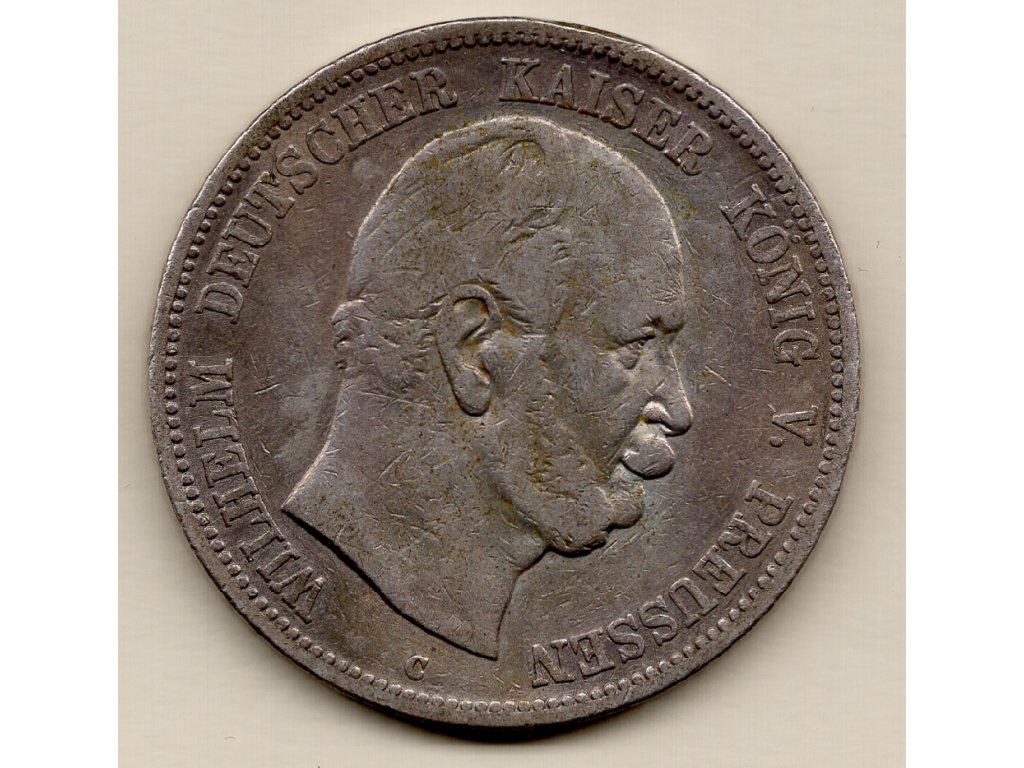 Tento kus o nominální hodnotě 5 Mark byl ražen v letech 1891–1908 za vlády Viléma II. (1888–1918), posledního německého císaře a pruského krále. Averz nese jeho výrazný portrét s charakteristickými rysy, zatímco reverz zdobí císařský orel, majestátní symbol jednoty a moci Německé říše. Pětimarky patřily k nejvyšším stříbrným nominálům své doby a byly raženy z kvalitního kovu o ryzosti .900. Tyto mince nejen sloužily v oběhu, ale také reprezentovaly mocenské a kulturní ambice císařského Německa před první světovou válkou. Po roce 1920 byly sice demonetizovány, avšak dnes jsou vyhledávanými sběratelskými artefakty, které přinášejí autentické svědectví o éře pruské dominance a císařské hrdosti.