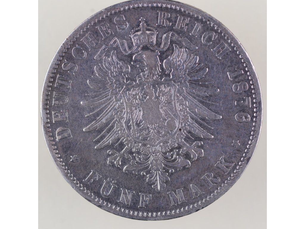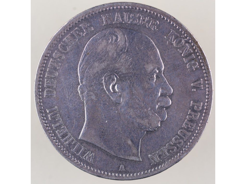 Tento kus o nominální hodnotě 5 Mark byl ražen v letech 1891–1908 za vlády Viléma II. (1888–1918), posledního německého císaře a pruského krále. Averz nese jeho výrazný portrét s charakteristickými rysy, zatímco reverz zdobí císařský orel, majestátní symbol jednoty a moci Německé říše. Pětimarky patřily k nejvyšším stříbrným nominálům své doby a byly raženy z kvalitního kovu o ryzosti .900. Tyto mince nejen sloužily v oběhu, ale také reprezentovaly mocenské a kulturní ambice císařského Německa před první světovou válkou. Po roce 1920 byly sice demonetizovány, avšak dnes jsou vyhledávanými sběratelskými artefakty, které přinášejí autentické svědectví o éře pruské dominance a císařské hrdosti.