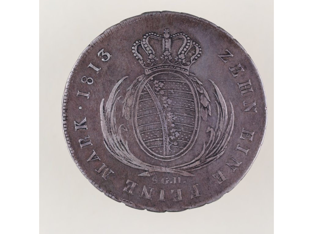Reverz dominuje korunovaný oválný znak Saska s dubovými a palmovými ratolestmi, doplněný nápisem ZEHN EINE FEINE MARK a datací 1813. Tento údaj vyjadřuje ryzostní váhový standard – deset kusů těchto mincí odpovídalo jedné kolínské hřivně ryzího stříbra, což bylo v předmetrické Evropě běžné měřítko.