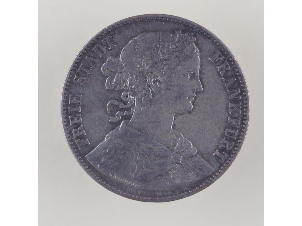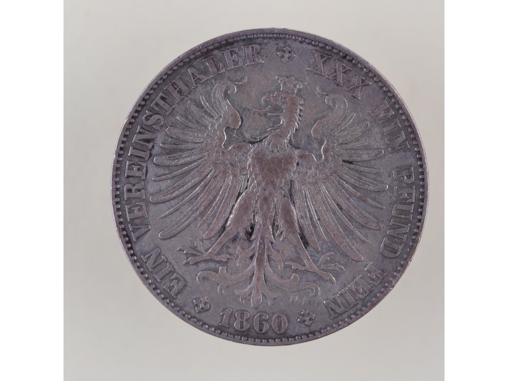 Tento krásně zpracovaný stříbrný tolar pochází z roku 1860, kdy Frankfurt nad Mohanem fungoval jako samostatné svobodné město v rámci Německého spolku. Město mělo vlastní mincovnu a vydávalo své měny až do roku 1866, kdy bylo po prusko-rakouské válce anektováno Pruskem. Averz zobrazuje ženskou personifikaci Frankfurtu s vavřínovou korunou, symbolizující svobodu a městskou hrdost. Opis FREIE STADT FRANKFURT připomíná status města jako nezávislé entity.