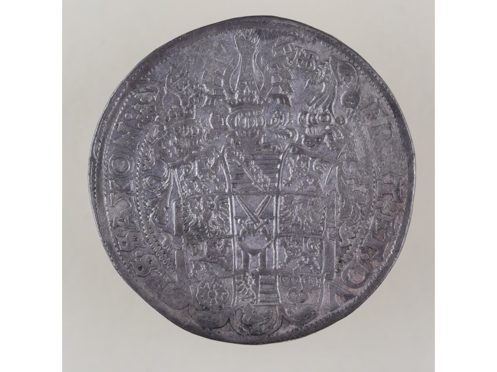 Reverz dominuje bohatě členěný rodový erb Wettinů, rozdělený na mnoho polí, která odkazují na dědičné země a tituly. V horní části je znak saských kurfiřtů se zkříženými meči, což zdůrazňuje jejich významnou úlohu v říšské volbě. Ražba je signována iniciálami HB pro mincmistra Hansa Bienera, který působil v Drážďanech. Tato mince je nejen platidlem své doby, ale i reprezentativním symbolem politického postavení a kulturního vkusu saského dvora.