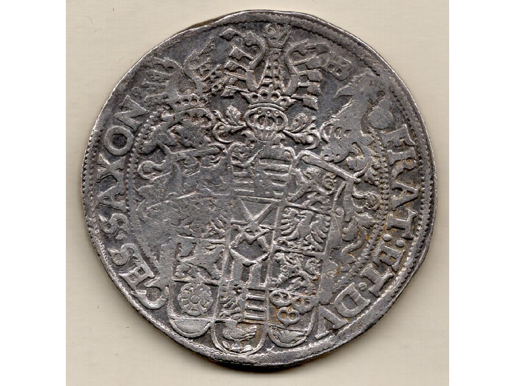 Reverz pak nese mimořádně bohatý, korunovaný saský erb s množstvím dílčích znaků jednotlivých zemí a panství, doplněný mincovní značkou HB (pravděpodobně mincmistr Hans Biener). V katalogu je tento typ evidován např. pod Davenport 9822. Mince má vysokou uměleckou a historickou hodnotu – nejen kvůli zobrazení vládců, ale i kvůli tomu, že byla ražena v omezeném množství a je považována za reprezentativní, nikoli běžně oběžný tolar. Exemplář nese známky oběhu, avšak hlavní motivy jsou dobře čitelné.