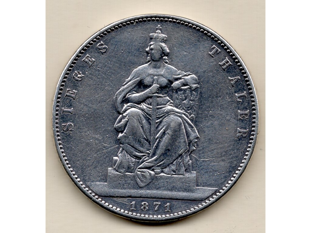 Tento pamětní tolar, známý jako „Siegesthaler“, byl ražen v roce 1871 v Berlíně (značka „A“) na počest vítězství Pruska ve francouzsko-pruské válce (1870–1871). Averz nese portrét krále Viléma I. s opisem WILHELM KOENIG VON PREUSSEN, reverz zobrazuje ženskou postavu symbolizující personifikaci Německa – se štítem a mečem – jako připomínku vojenského vítězství a nově vzniklého Německého císařství.