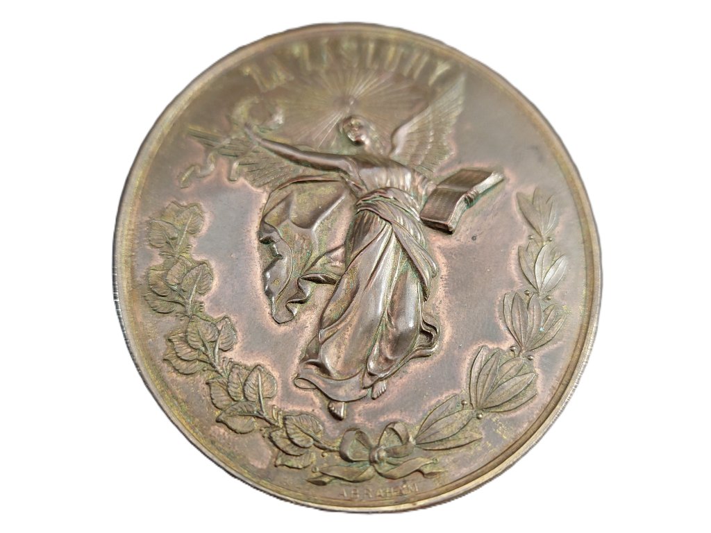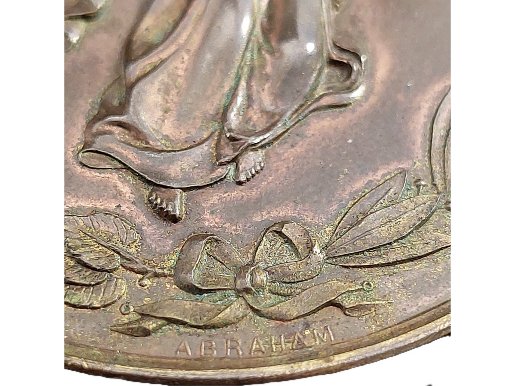 Reprezentativní bronzová medaile z roku 1894 připomíná Hospodářskou, průmyslovou a národopisnou výstavu v Hradci Králové – důležitou regionální událost v období národního obrození a technického pokroku českých zemí. Na averzu je vyobrazena letící okřídlená bohyně Niké, držící v jedné ruce věnec vavřínu a ve druhé otevřenou knihu – symbol vítězství ducha a vědění. Vavřínový věnec lemující scénu podtrhuje slavnostní a vítězný charakter. Pod kompozicí je signatura autora ABRAHAM, pravděpodobně vídeňského nebo pražského medailéra působícího koncem 19. století.