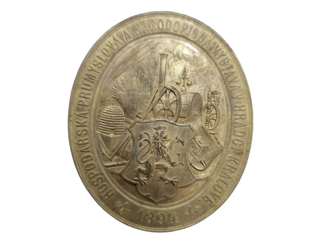 Reverz zobrazuje městský znak Hradce Králové s českým lvem, doprovázený atributy zemědělství a průmyslu – parní stroj, obilní klasy, včelí úl, mlýnské kolo a další. Opis HOSPODÁŘSKÁ PRŮMYSLOVÁ A NÁRODOPISNÁ VÝSTAVA V HRADCI KRÁLOVÉ rámuje celé pole a v dolní části je uveden letopočet 1894. Tato medaile představuje nejen upomínku na významnou kulturní a technickou událost, ale i důležitý pramen k vývoji medailérského umění v českých zemích.