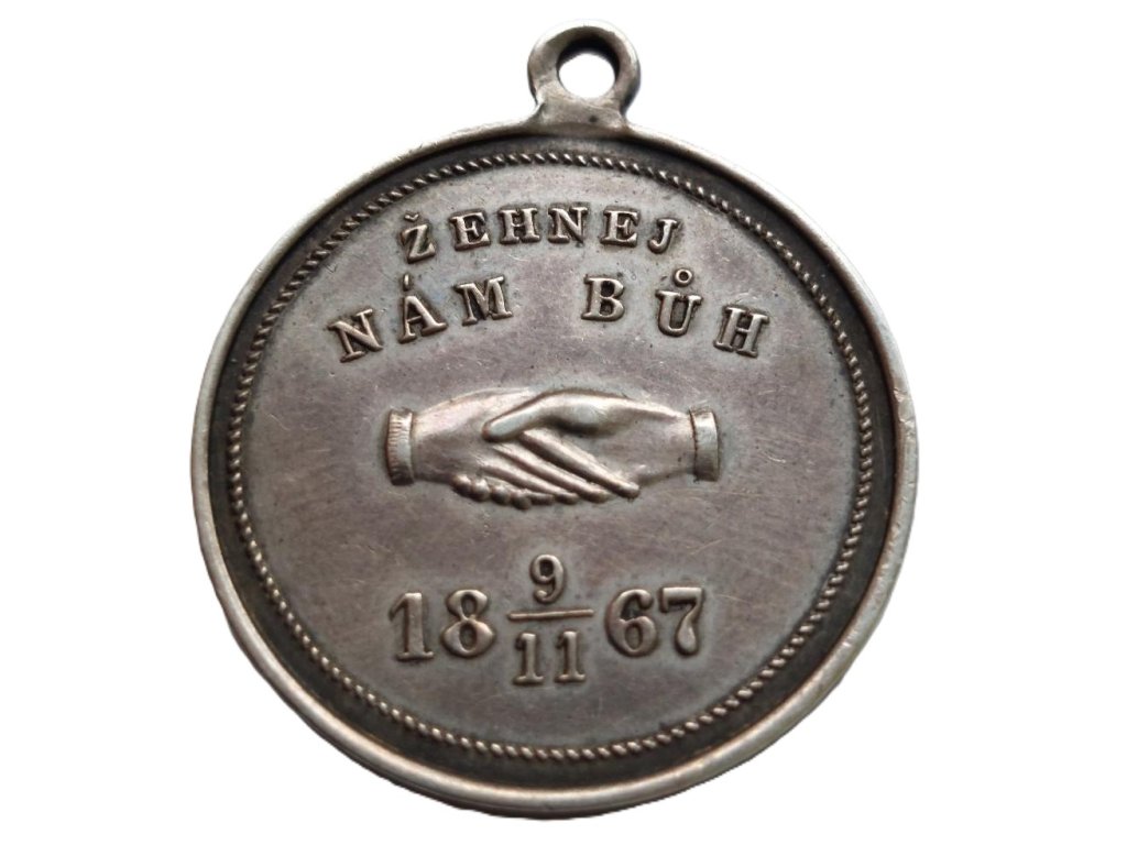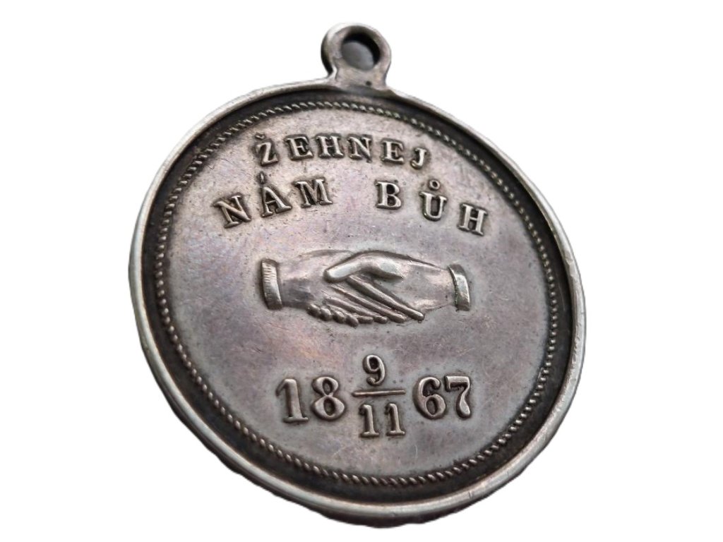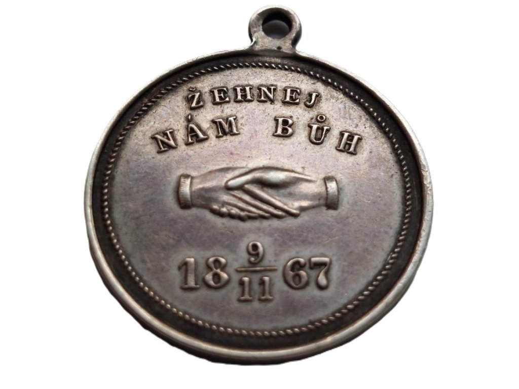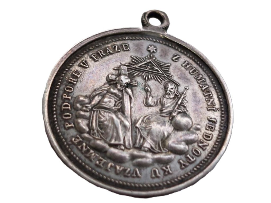 Tato stříbrná medaile z roku 1867 vznikla jako upomínka na činnost humanitní jednoty ku vzájemné podpoře v Praze, tedy spolku založeného na principech solidarity a vzájemné pomoci. Tyto jednoty působily v duchu filantropie a křesťanské etiky a podporovaly své členy v těžkých životních situacích.