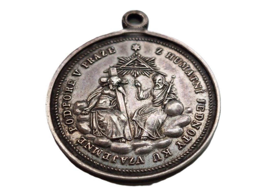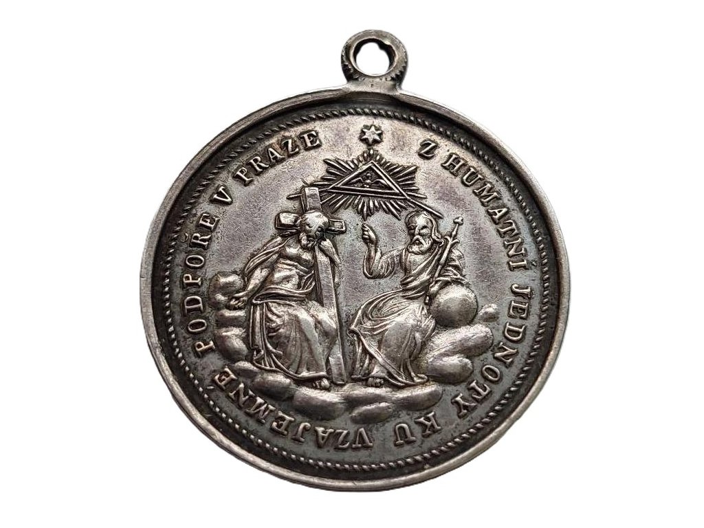 Dominantním výjevem na medaili je symbol Nejsvětější Trojice: Bůh Otec s královskými insigniemi, Kristus s křížem a Duch svatý ztvárněný v podobě paprsků s Božím okem ve svatozáři trojúhelníku. Oba sedí na obláčcích, což celé kompozici dodává barokně duchovní charakter. Nápis v češtině zdůrazňuje ideu vzájemnosti a podpory: „Z humanitní jednoty ku vzájemné podpoře v Praze“.
