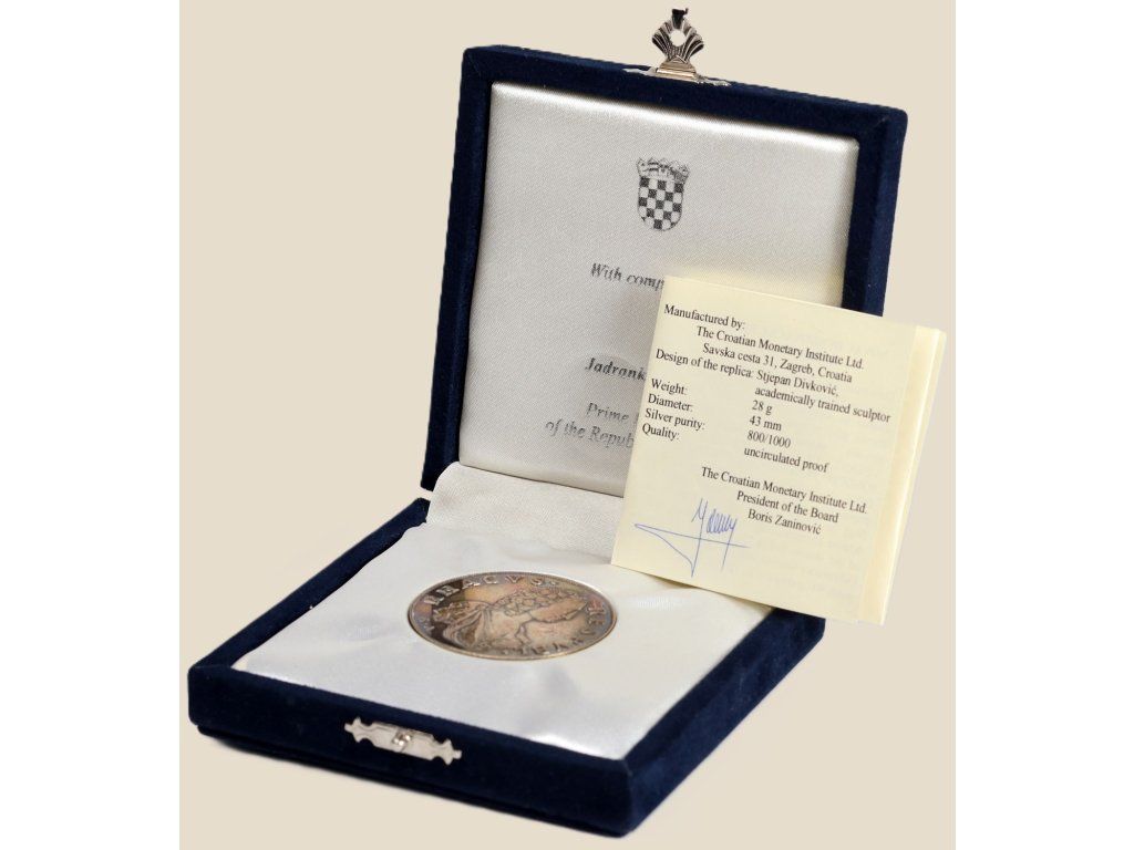 Nabízený kus je moderní replikou této historické mince, vyrobenou chorvatskou institucí The Croatian Monetary Institute Ltd. podle návrhu akademického sochaře Stjepana Divkoviće. Replika zachovává podobu původní ražby a je provedena ve stříbře o ryzosti 800/1000 v kvalitě proof, což znamená mimořádně precizní zpracování s důrazem na detail a kontrast povrchů.