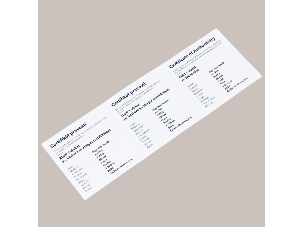 Svatý Václav – zlatý 1-dukát se zlatým certifikátem, Česká mincovna 2020