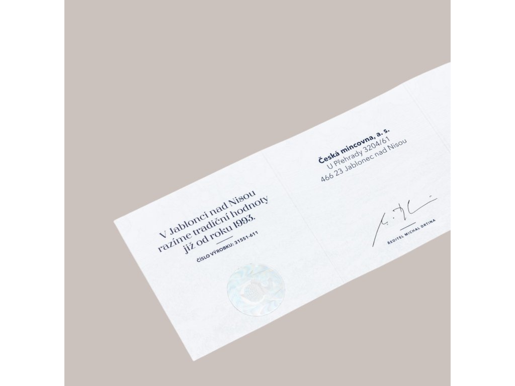 Mince je vyrobena ze zlata o ryzosti 986/1000, s hmotností 3,49 g a průměrem 20 mm. Výjimečnost této emise podtrhuje limitace 1000 ks a unikátní zlatý certifikát, který je nedílnou součástí balení. To činí tento kus mimořádně atraktivním jak z hlediska investičního zlata, tak sběratelského významu.
