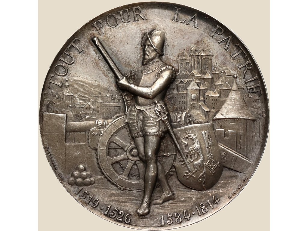 Averz medaile zobrazuje ozbrojeného obránce s doutnákovou puškou na pozadí panoramatu Ženevy. Letopočty 1519–1526 a 1584–1814 připomínají klíčová období městských dějin a zdůrazňují kontinuitu samostatnosti a republikánské tradice. Autory návrhu byli E. Lossier (INV.) a H. Bovy (F.), přičemž na averzu je rovněž uvedena signatura Richard (F.).