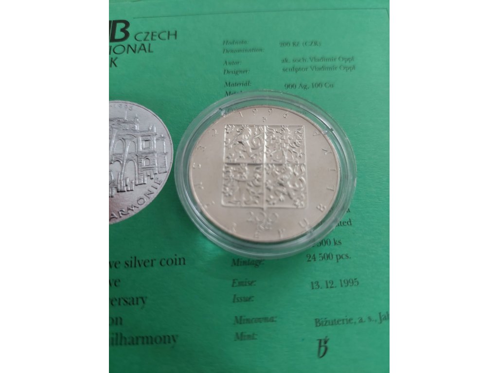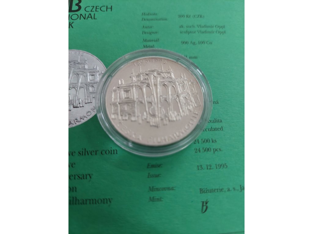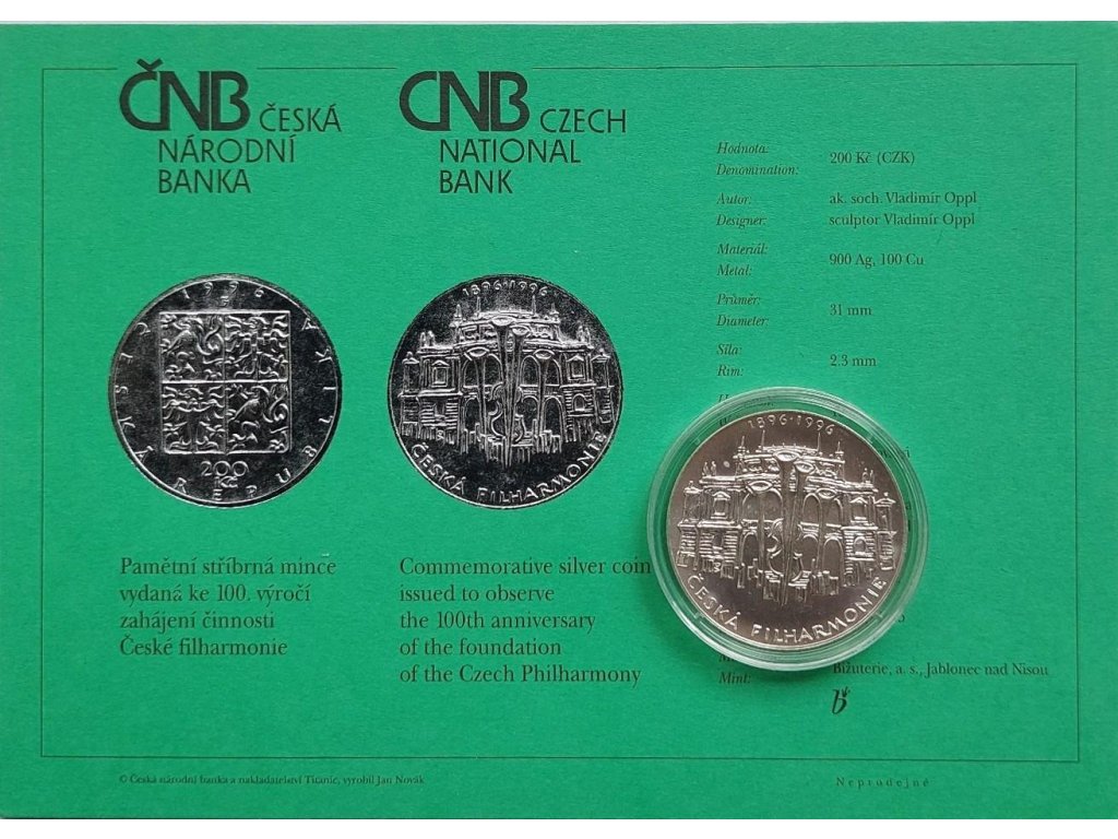 Stříbrná pamětní mince v nominální hodnotě 200 Kč byla vydána Českou národní bankou v roce 1996 k oslavě 100. výročí České filharmonie, prestižního orchestru, který od svého založení v roce 1896 reprezentuje českou hudební kulturu po celém světě. Averz mince zdobí státní znak České republiky, pod nímž je nominální hodnota 200 Kč a letopočet 1996. Reverz zobrazuje stylizovaný motiv budovy Rudolfina, sídla České filharmonie, doplněný letopočty 1896–1996 a nápisem ČESKÁ FILHARMONIE. Tato kombinace symbolů zdůrazňuje význam orchestru i jeho kulturní odkaz.