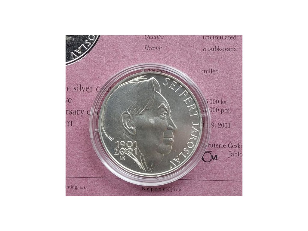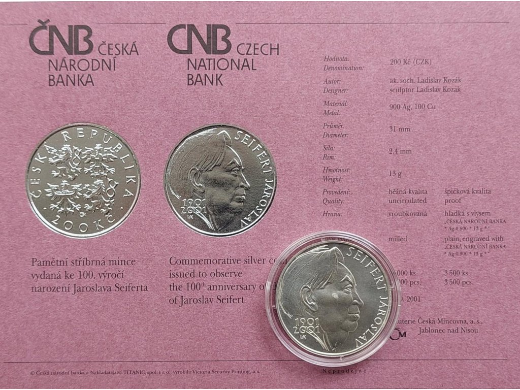 Stříbrná pamětní mince s nominální hodnotou 200 Kč, vydaná Českou národní bankou v roce 2001, připomíná 100 let od narození Jaroslava Seiferta (1901–1986), významného českého básníka a nositele Nobelovy ceny za literaturu. Averz mince nese stylizovaný velký státní znak České republiky doplněný nápisem „ČESKÁ REPUBLIKA“ a hodnotou „200 Kč“. Reverz zobrazuje portrét Jaroslava Seiferta v profilu, s jemným výrazem a dynamickými liniemi, které odkazují na jeho poetickou tvorbu. Doplňuje ho nápis „JAROSLAV SEIFERT“ a letopočty 1901–2001. Mince je ražena ze stříbra o ryzosti 900/1000, hmotnost činí 13 g a průměr dosahuje 31 mm. Mincovna Česká mincovna v Jablonci nad Nisou garantuje špičkové řemeslné provedení v běžné kvalitě i proof.