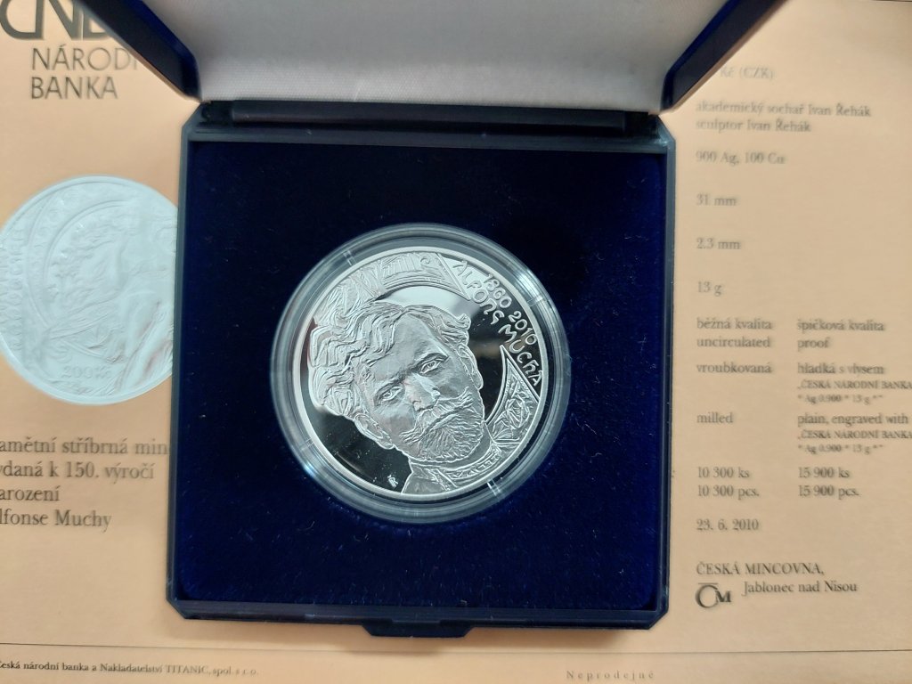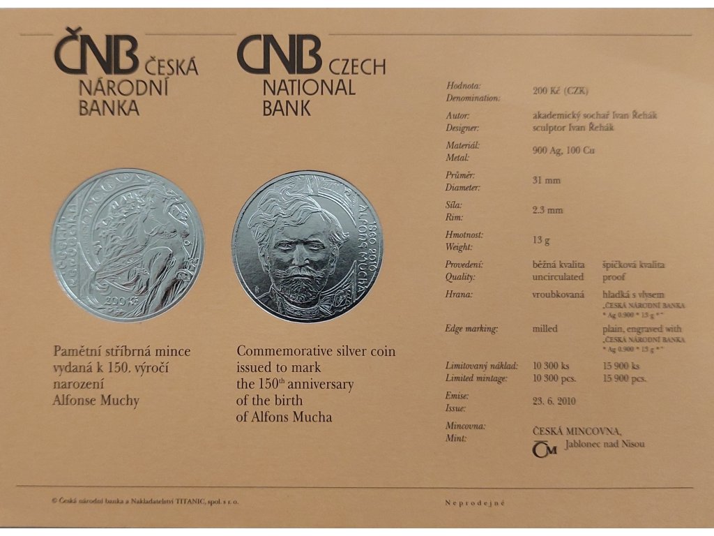 Stříbrná pamětní mince v nominální hodnotě 200 Kč byla vydána Českou národní bankou v roce 2010 k připomenutí 150. výročí narození Alfonse Muchy (1860–1939), světově proslulého malíře, grafika a představitele secesního stylu. Averz mince zobrazuje výtvarné prvky z Muchovy slavné Slovanské epopeje, reverz pak portrét samotného umělce s letopočty 1860–2010.