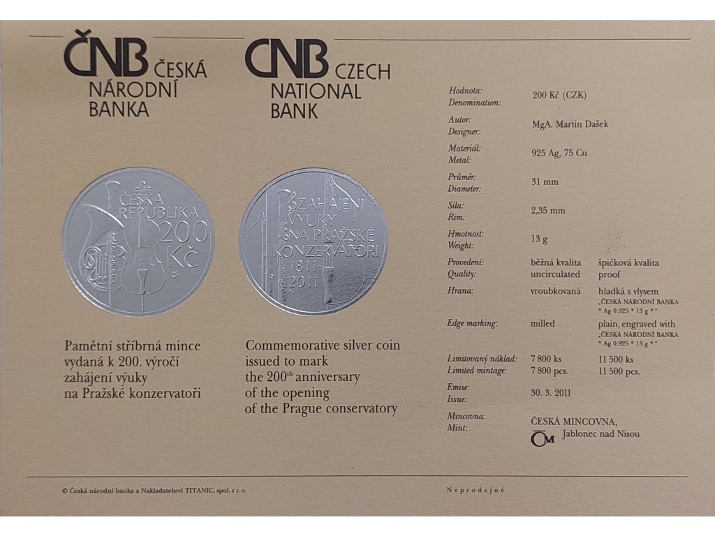 Stříbrná pamětní mince s nominální hodnotou 200 Kč byla vydaná Českou národní bankou v roce 2011 u příležitosti 200. výročí zahájení výuky na Pražské konzervatoři, nejstarší hudební škole ve střední Evropě. Od svého založení v roce 1811 se konzervatoř stala líhní významných skladatelů, dirigentů a instrumentalistů, kteří šířili českou hudbu po celém světě. Averz mince zobrazuje tubu a housle, symbolizující rozmanitost hudebních oborů, doplněné nápisem ČESKÁ REPUBLIKA a nominální hodnotou 200 Kč. Reverz nese nápis ZAHÁJENÍ VÝUKY NA PRAŽSKÉ KONZERVATOŘI a letopočty 1811–2011, spolu s motivy dechových nástrojů. Raženo v České mincovně v Jablonci nad Nisou, mince je vyrobena ze stříbra o ryzosti 925/1000 s příměsí mědi pro vyšší odolnost. Autorem návrhu je MgA. Martin Dašek. Vysoká umělecká kvalita a kulturní odkaz činí tuto minci atraktivní nejen pro sběratele, ale i pro hudební nadšence. Autenticitu potvrzuje vlys ČNB na hraně.