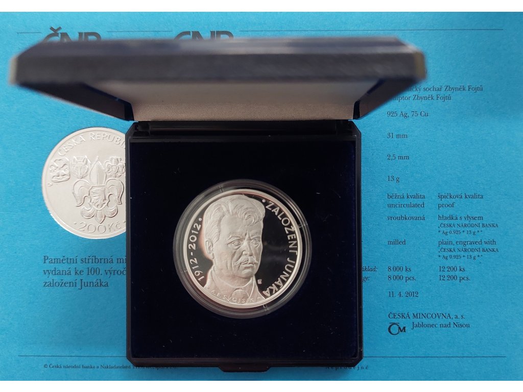 Stříbrná pamětní mince v nominální hodnotě 200 Kč byla vydána Českou národní bankou roku 2012 k příležitosti 100. výročí založení Junáka, největší české skautské organizace. Averz nese státní znak České republiky doplněný motivem skautské lilie, zatímco reverz zobrazuje portrét zakladatele českého skautingu Antonína Benjamina Svojsíka (1876–1938) s letopočty 1912–2012 a nápisem „Založení Junáka“.