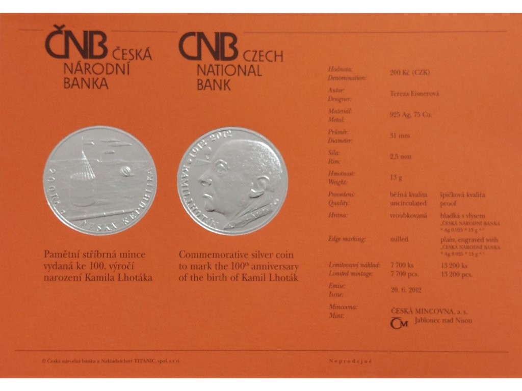 Stříbrná pamětní mince s nominální hodnotou 200 Kč, vydaná Českou národní bankou v roce 2012, připomíná 100 let od narození Kamila Lhotáka (1912–1990), významného českého malíře, grafika a ilustrátora. Averz mince zdobí motiv inspirovaný Lhotákovými obrazy — stylizovaná krajina s balónem a technickými prvky, které odkazují na jeho fascinaci technikou a poetikou městských okrajů, doplněná nápisem „ČESKÁ REPUBLIKA“ a hodnotou „200 Kč“. Reverz nese portrét Kamila Lhotáka v profilu s nápisem „KAMIL LHOTÁK“, letopočty 1912–2012 a jeho vlastnoručním podpisem. Mince je ražena ze stříbra o ryzosti 925/1000, její hmotnost je 13 g a průměr dosahuje 31 mm. Mincovna Česká mincovna v Jablonci nad Nisou zaručuje špičkové zpracování v běžné kvalitě i proof.