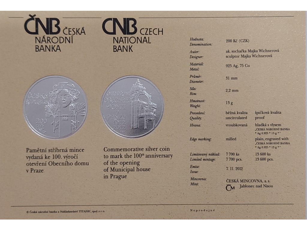Stříbrná pamětní mince s nominální hodnotou 200 Kč, vydaná Českou národní bankou v roce 2012, připomíná 100 let od otevření slavného Obecního domu v Praze (1912–2012), jednoho z nejvýznamnějších secesních monumentů v české architektuře. Averz mince zdobí stylizovaná ženská hlava inspirovaná výzdobou budovy, doplněná květinovými motivy, nápisem „ČESKÁ REPUBLIKA“ a nominální hodnotou „200 Kč“. Reverz zobrazuje monumentální secesní portál Obecního domu s nápisem „OTEVŘENÍ OBECNÍHO DOMU V PRAZE 1912–2012“, který připomíná jeho kulturní význam. Mince je ražena ze stříbra o ryzosti 925/1000, hmotnost činí 13 g a průměr dosahuje 31 mm. Mincovna Česká mincovna v Jablonci nad Nisou zajišťuje dokonalé řemeslné provedení v běžné kvalitě i proof.