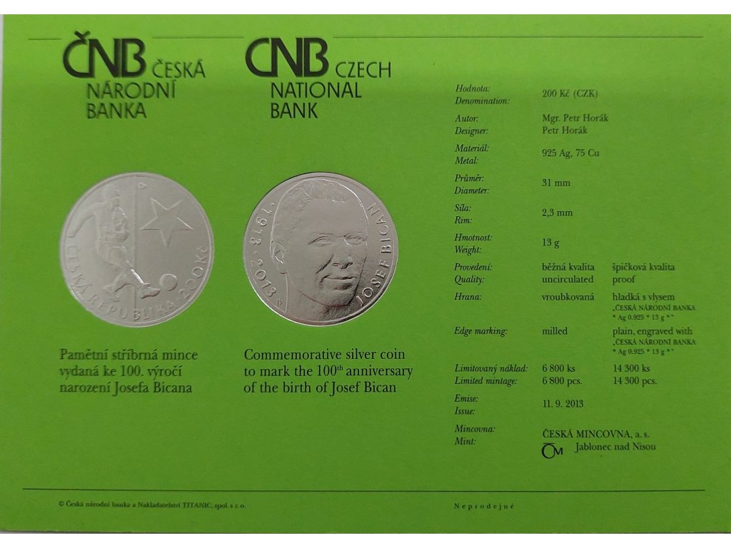 Stříbrná pamětní mince v nominální hodnotě 200 Kč byla vydána Českou národní bankou v roce 2013 u příležitosti 100. výročí narození Josefa Bicana (1913–2001), jednoho z nejlepších fotbalových střelců historie a legendy pražské Slavie. Reverz mince nese Bicanův portrét s letopočty 1913–2013, zatímco averz zobrazuje fotbalistu při kopu do míče a výraznou hvězdu, symbol klubu SK Slavia Praha.