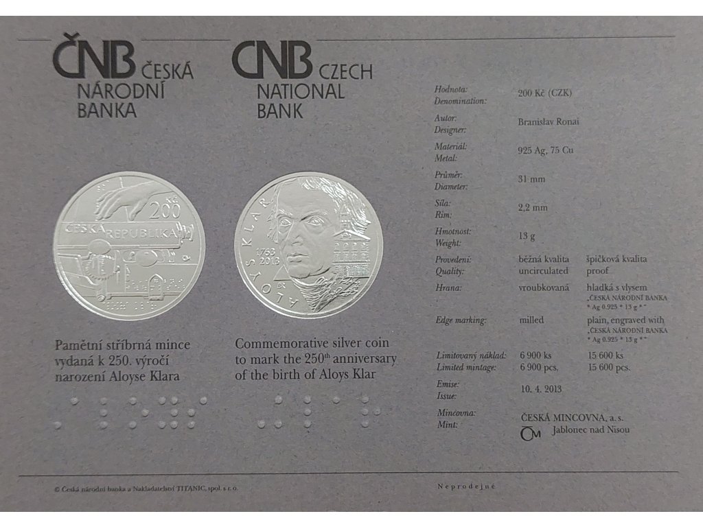 200 Kč 2013 – 250. výročí narození Aloyse Klara Proof