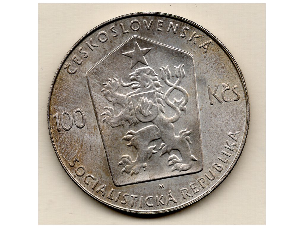 Revers zobrazuje státní znak Československé socialistické republiky s českým lvem, pěticípou hvězdou a socialistickým štítem, doplněný nominální hodnotou 100 Kčs. Kompozice je střídmá a typická pro oficiální pamětní ražby tohoto období.